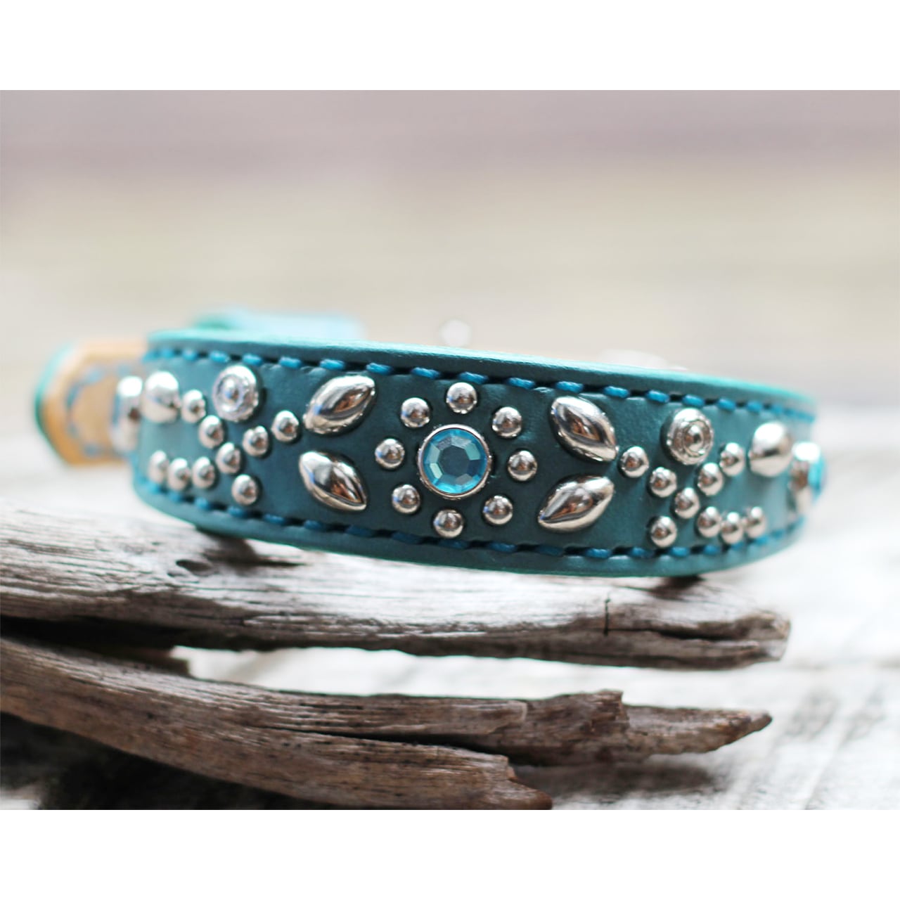 太目ベルトループについた飾りと首輪のお花のモチーフがか
