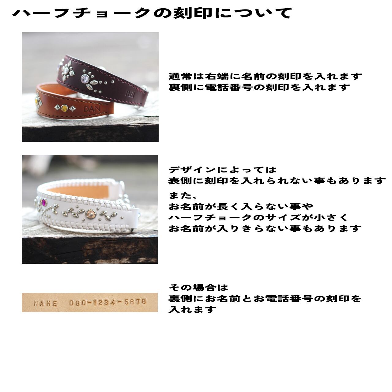 サイズ、引きの強さ、犬種、革色、お名前、お電話番号など伺ってから製作します