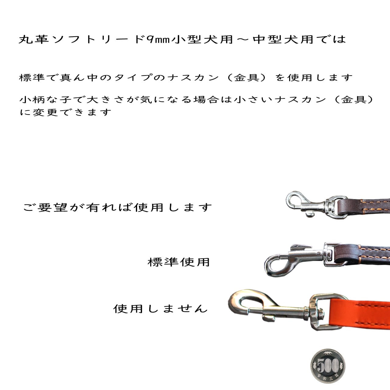 こちらのリードのナスカン(首輪につなぐ金具)はニッケル(銀色)ですが、真ちゅう製金具やステンレス製金具も誤用しております。
